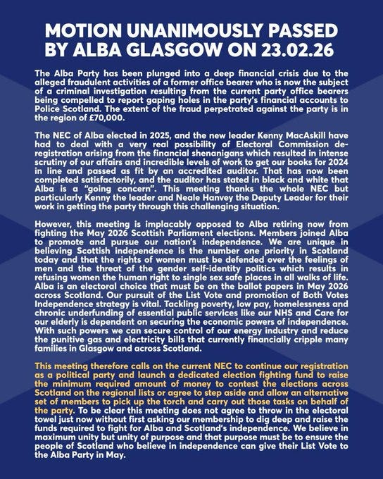 After a day spent on a sojourn to Ninewells Hospital in Dundee from my home in Perth (a bus journey defined as the longest distance between two points) during which I had little chance to keep up with developments, the first thing I saw when I went online this morning was a statement from Alba Glasgow posted on Tommy Sheridan’s X account (see above).