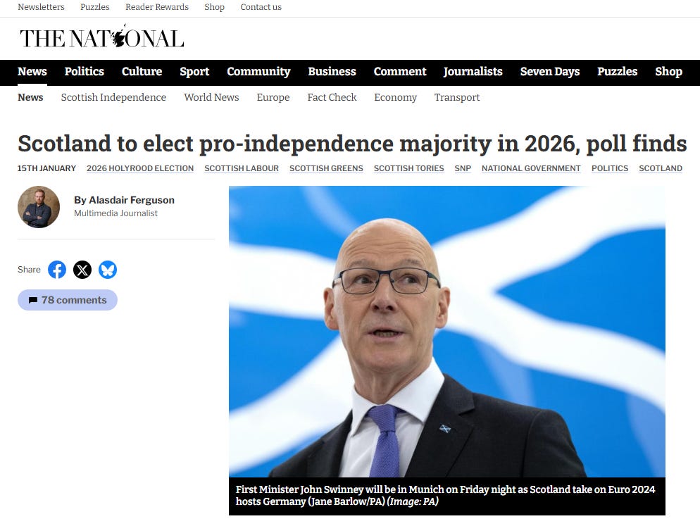 When I see a headline in The National breathlessly declaring Scotland to elect pro-independence majority in 2026, poll finds, my first reaction is to check the date lest I have somehow lighted upon the same or similar story from last week, or the week before. My second reaction is to inwardly shrug and ask, “So what?”. The three previous elections also produced nominally pro-independence majorities. The last five have resulted in nominally pro-independence governments. Yet here we remain, still annexed territory of England-as-Britain! Clearly, what The National refers to as a “pro-independence majority” is not sufficient to rid us of the Union.